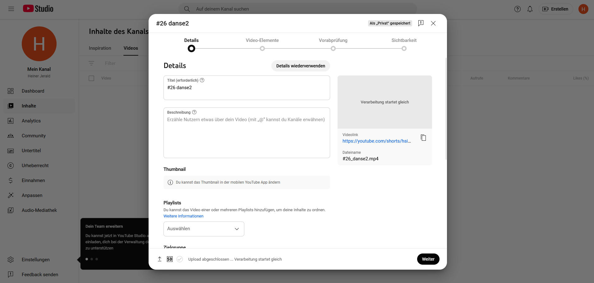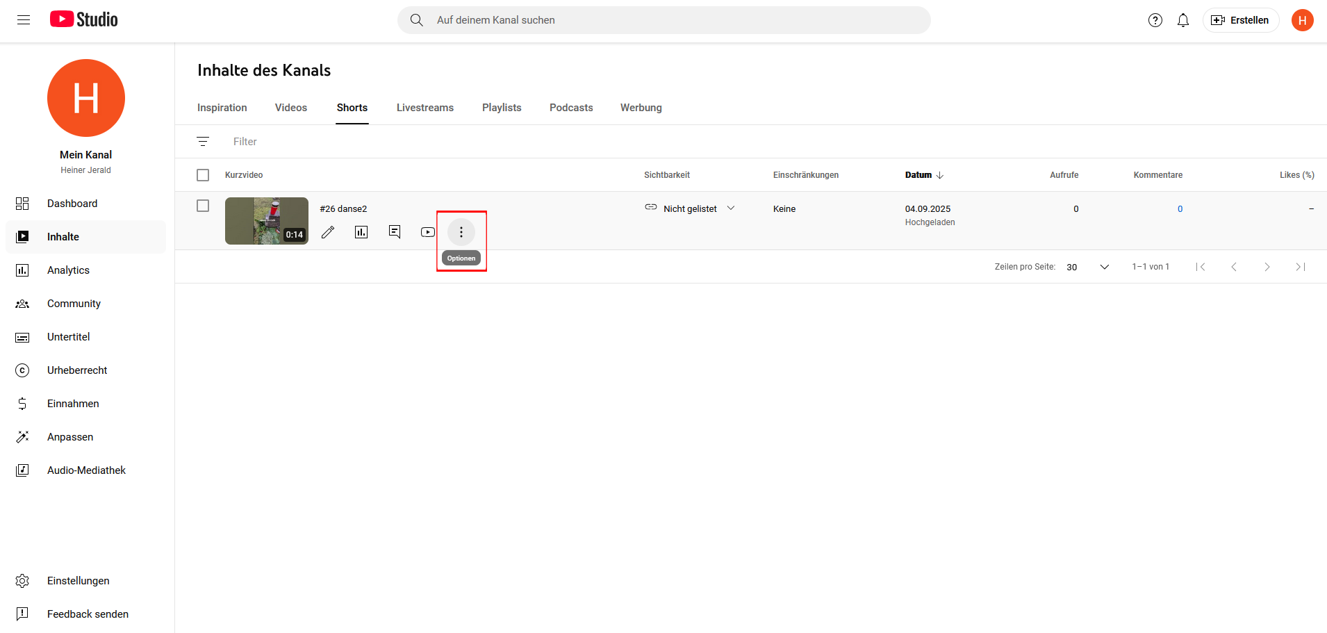 Nun erscheint auf Ihrem Kanal ein Eintrag. YouTube kategorisiert Ihr hochgeladenes Video automatisch unter „Shorts“ oder unter „Videos“.