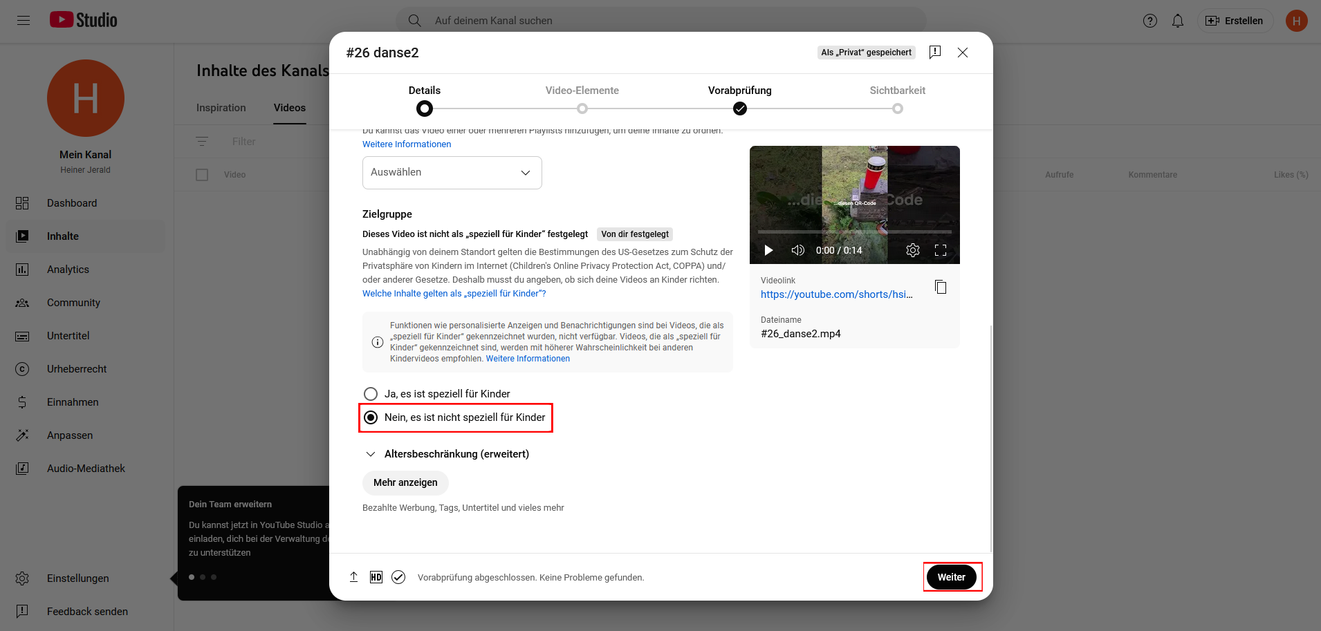 Scrollen Sie etwas runter. YouTube erfordert das Festlegen, ob das Video „speziell für Kinder“ ist.