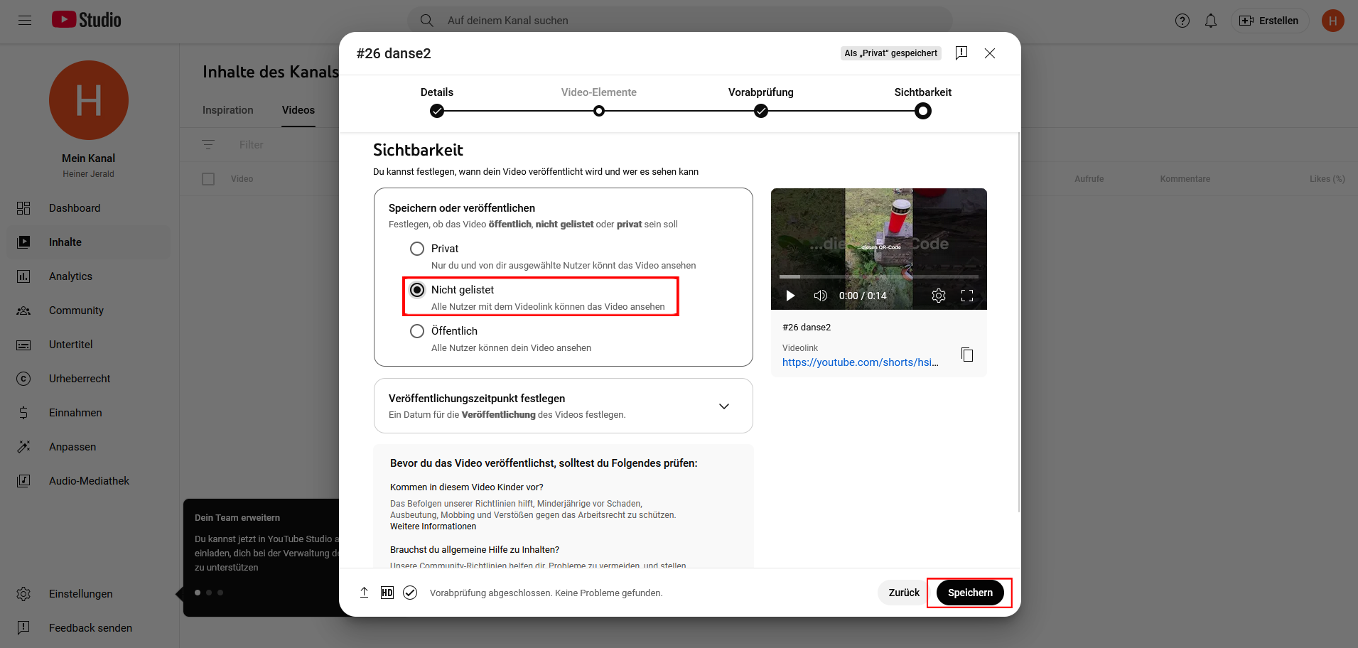 Sofern Ihr Video nur für private Zwecke genutzt werden soll, empfehlen wir das Video auf „nicht gelistet“ zu schalten.