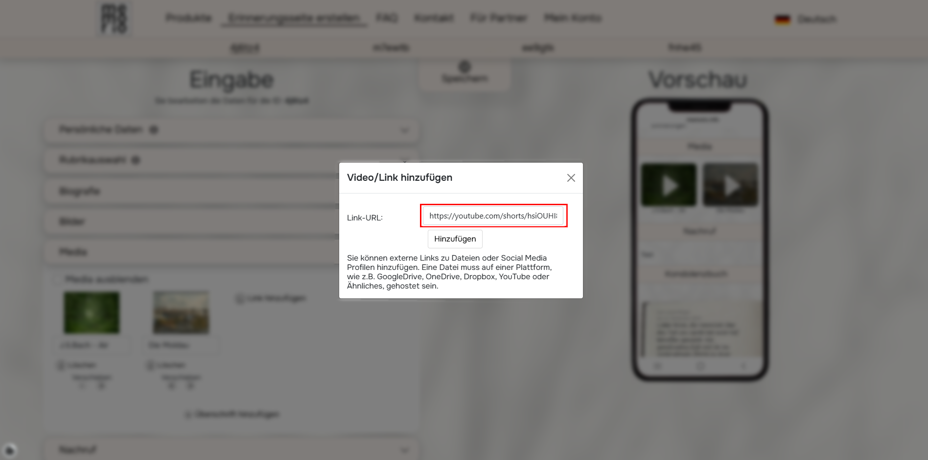 Diesen Link können Sie nun unter der Rubrik „Media“ in Ihrer Erinnerungsseite hinzufügen. Nachdem Sie auf „Hinzufügen“ geklickt haben, wird ein kleines Vorschaubild zu dem Video in die Erinnerungsseite integriert.
