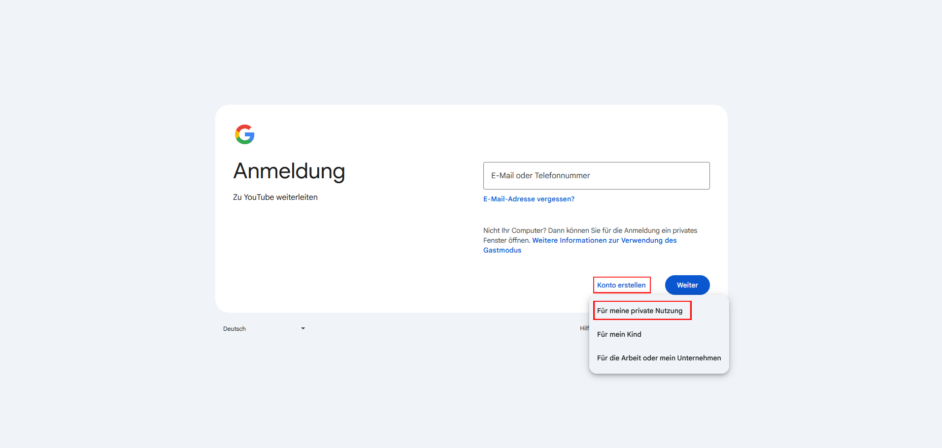 Sofern Sie noch kein YouTube-Konto haben, klicken Sie auf „Konto erstellen“ und auf „Für meine private Nutzung“.