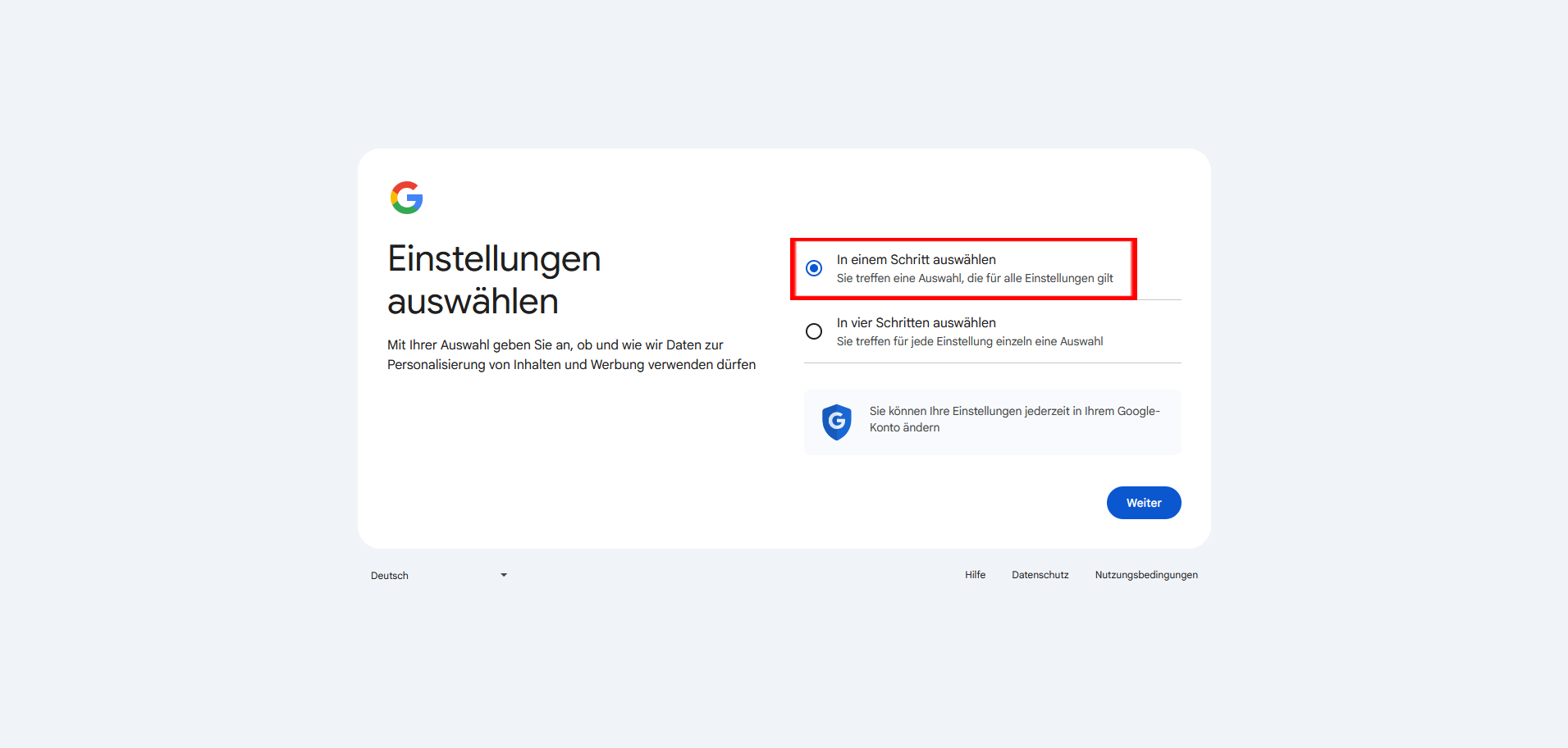 Nachdem Sie das Passwort für Ihr YouTube-Konto erstellt haben, wählen Sie bitte bei dem Punkt „Einstellungen auswählen“ die Option „In einem Schritt auswählen“.