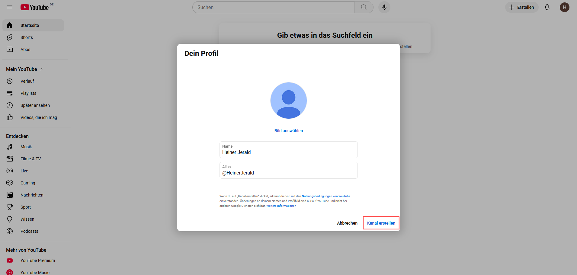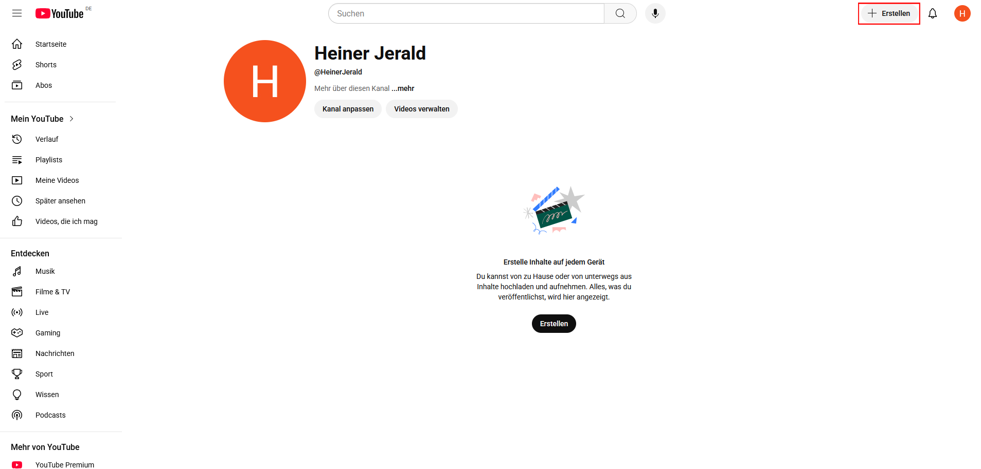 Sie müssen zunächst einen Kanal erstellen, um Videos hochladen zu können. Klicken Sie auf „Kanal erstellen“.