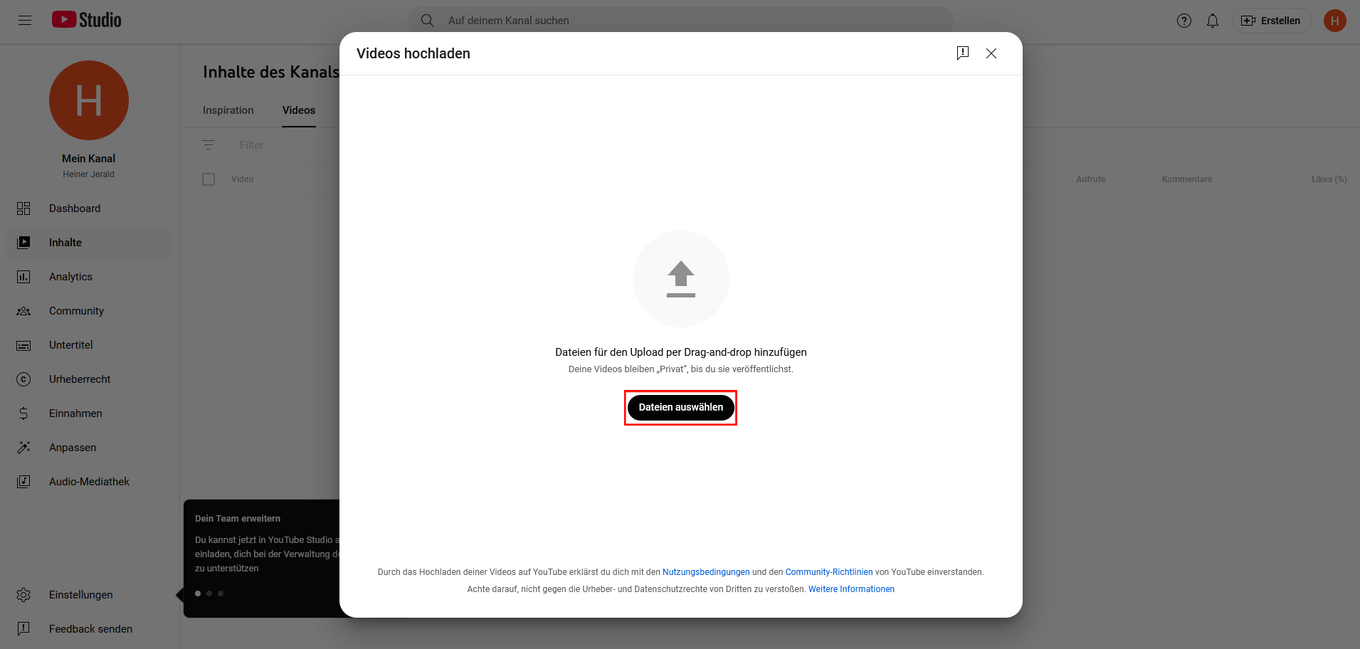 Sobald der Kanal erstellt ist, landen Sie auf diesen Bildschirm. Klicken Sie auf „Erstellen“ und auf „Video hochladen“.